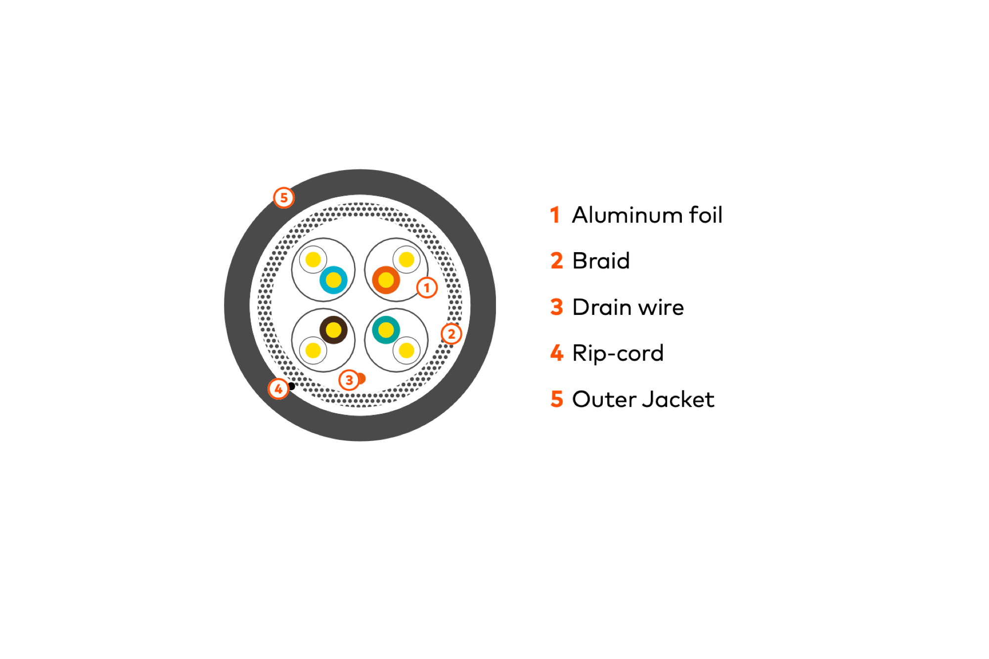 • Individual pair shielding: Aluminum foil, providing 100 % coverage