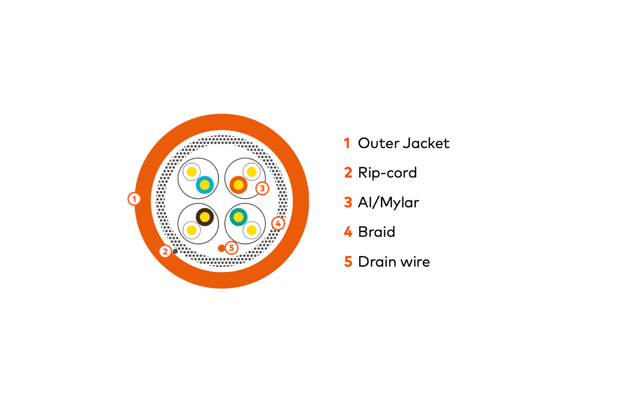 • Shielding: S-FTP, pairs in metal foil and braid shielding